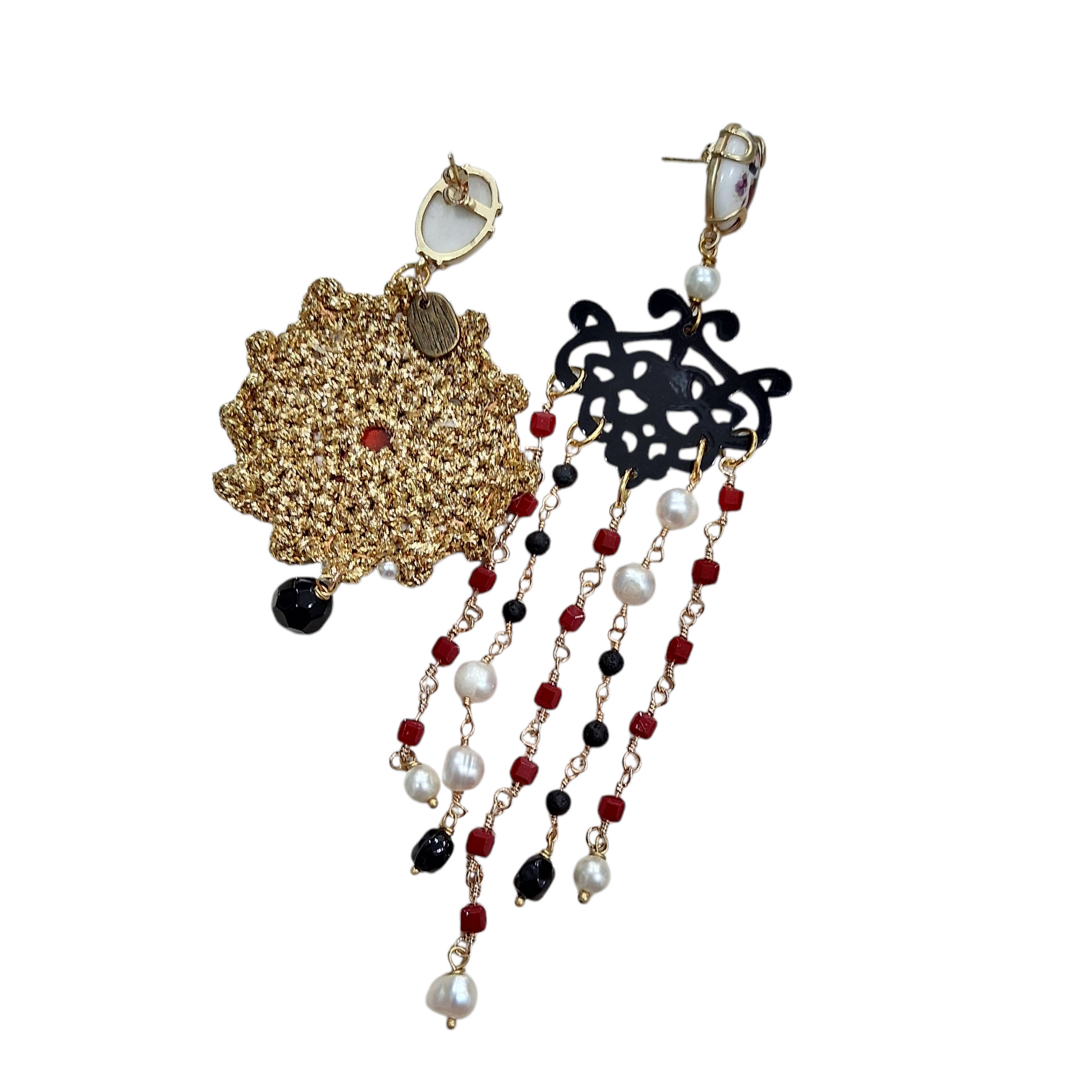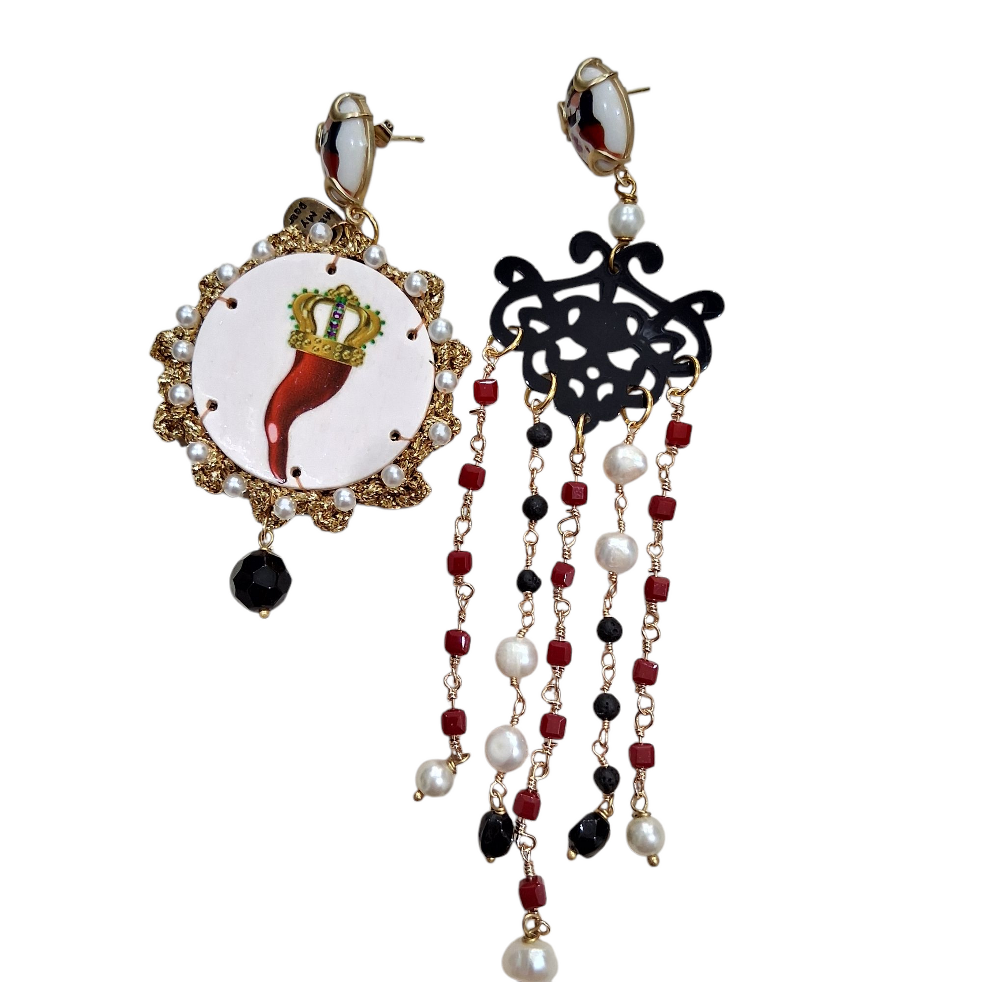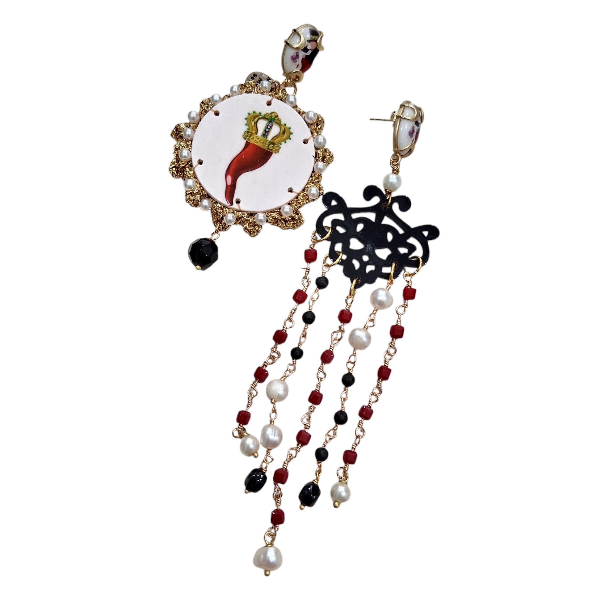 These bold handmade earrings from Italy feature an asymmetric design blending folklore and elegance. One earring showcases a crowned red horn talisman on a white resin base with golden crochet and pearls. The other boasts a dramatic black structure with cascading chains of pearls and red and black beads. Lengths: 9 cm and 15 cm, width 4 cm.