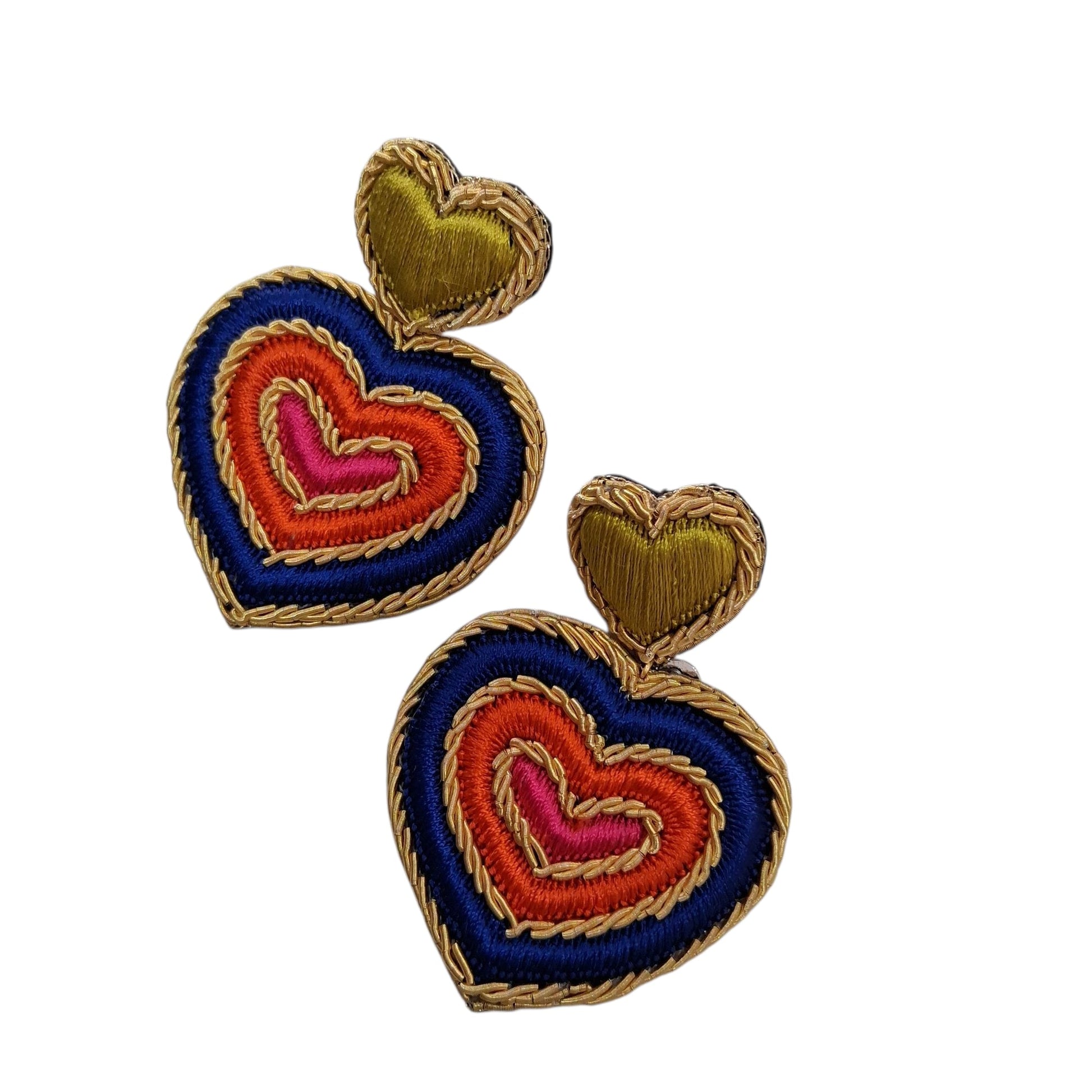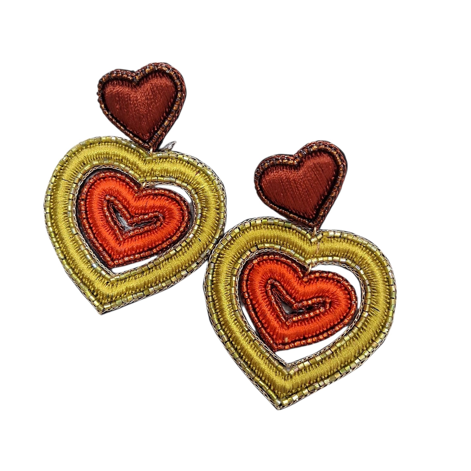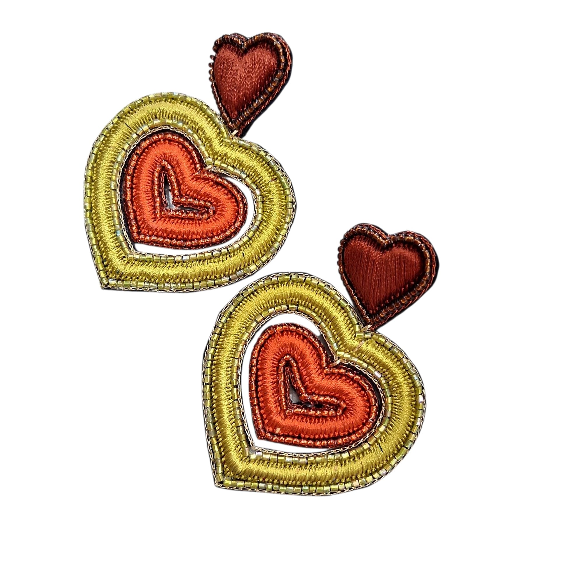 Orecchini Doppio Cuore Ricamati a Mano nei Toni Oro e Rame