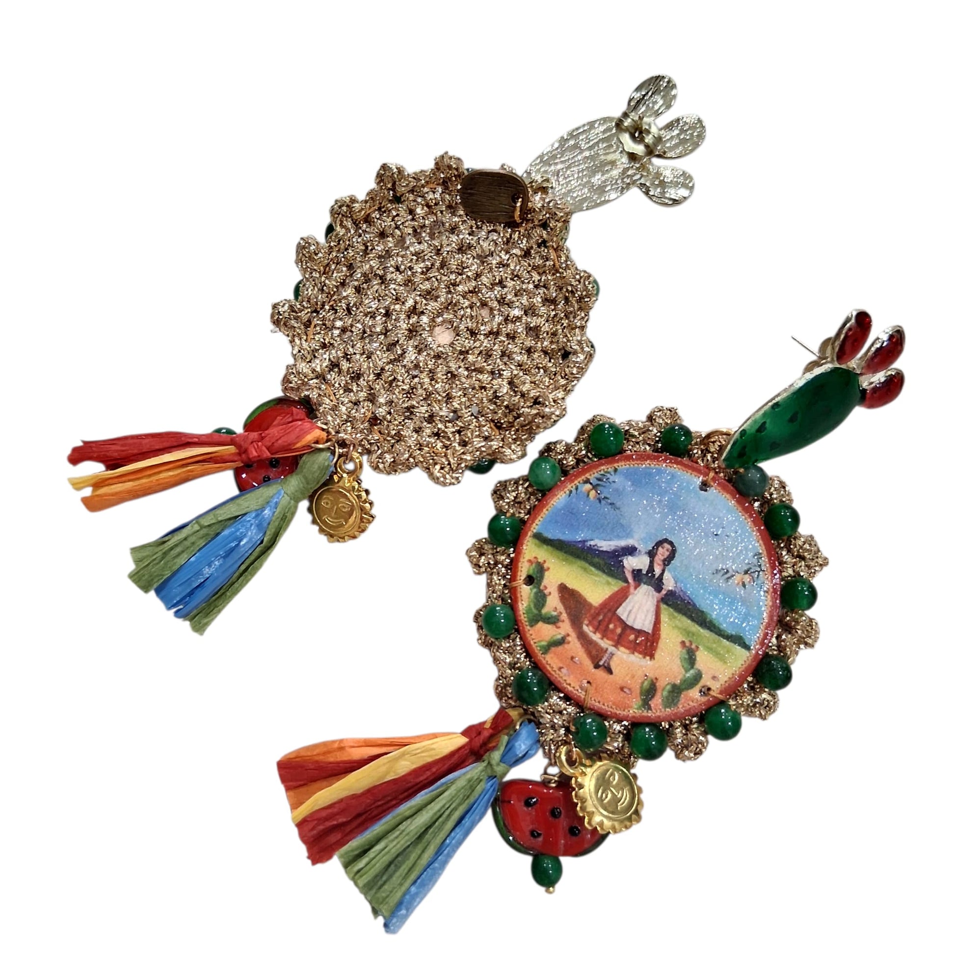 Boucles d’oreilles artisanales au style méditerranéen, inspirées des couleurs et paysages de la Sicile. Le pendentif central représente une scène traditionnelle, entourée de perles vertes et de détails dorés. La partie supérieure évoque la figue de barbarie, symbole emblématique de l’île, tandis que les pompons multicolores apportent mouvement et vivacité.