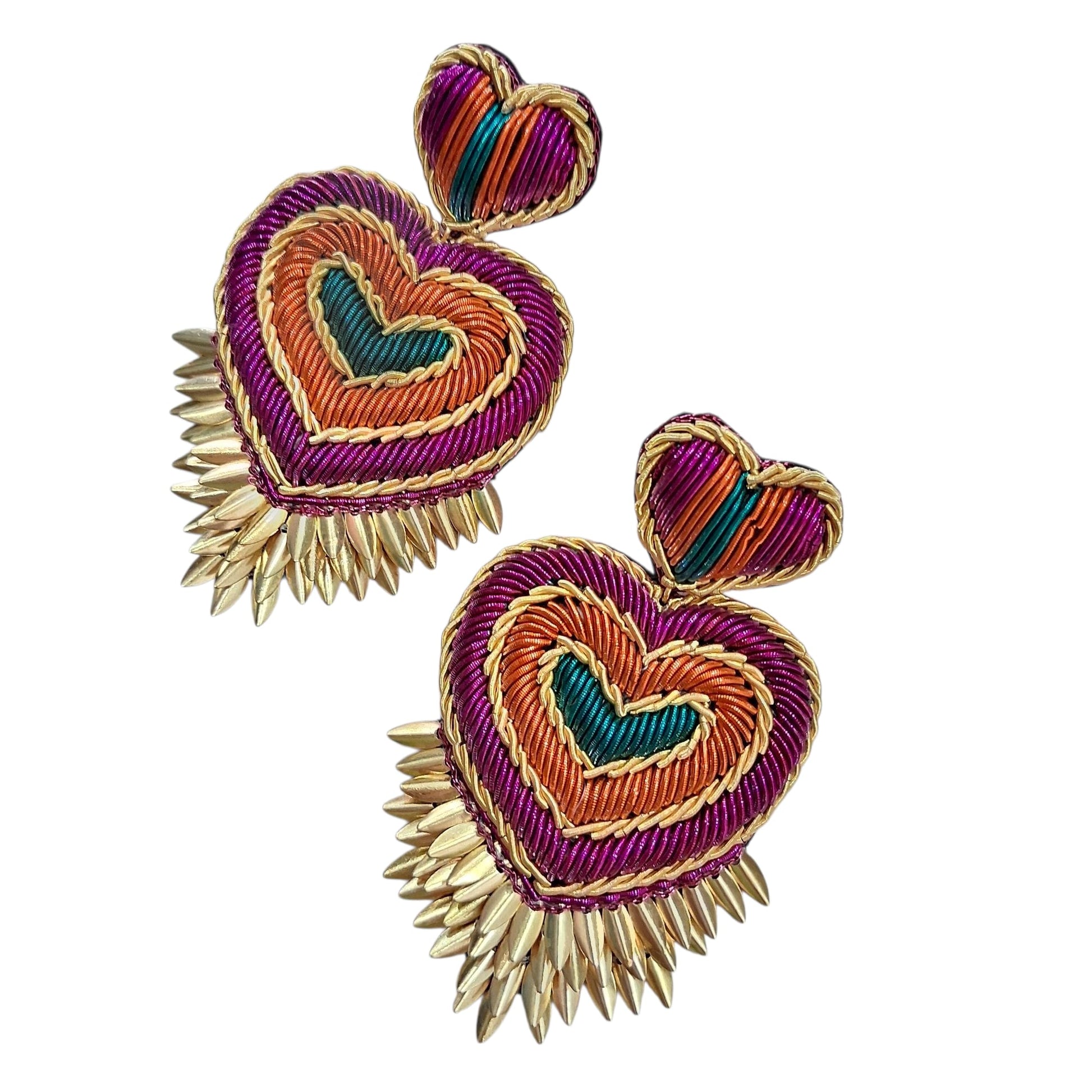 Inspirées du cœur sacré, ces boucles d’oreilles artisanales offrent un jeu de couleurs éclatantes et de textures raffinées. Brodées à la main avec des fils colorés fuchsia, orange et vert émeraude, elles sont sublimées par des rayons dorés lumineux. Mesurant 8 cm x 5 cm, elles apportent une touche audacieuse et spirituelle à toute tenue.
