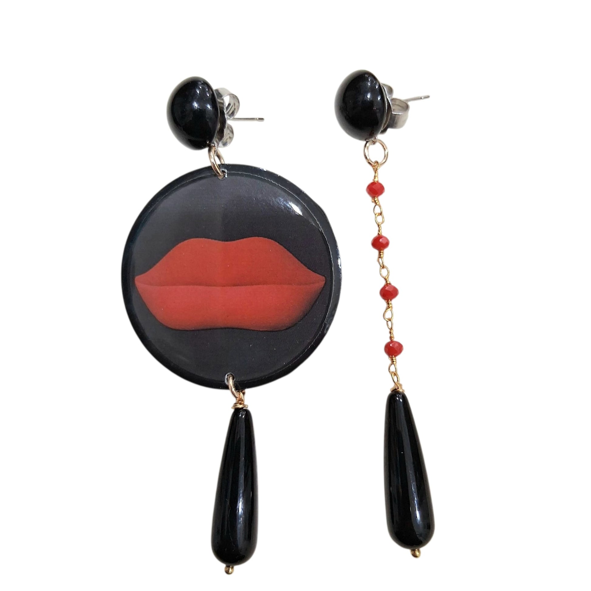 Boucles d’oreilles asymétriques ornées d’un motif “Lips” rouge, inspiré du célèbre canapé “Boca” de Salvador Dalí. L’ensemble alterne un pendentif rond et une fine chaîne perlée, tous deux terminés par une goutte noire brillante. La dimension totale est de 8 cm x 4 cm. Une pièce audacieuse, artistique et moderne.