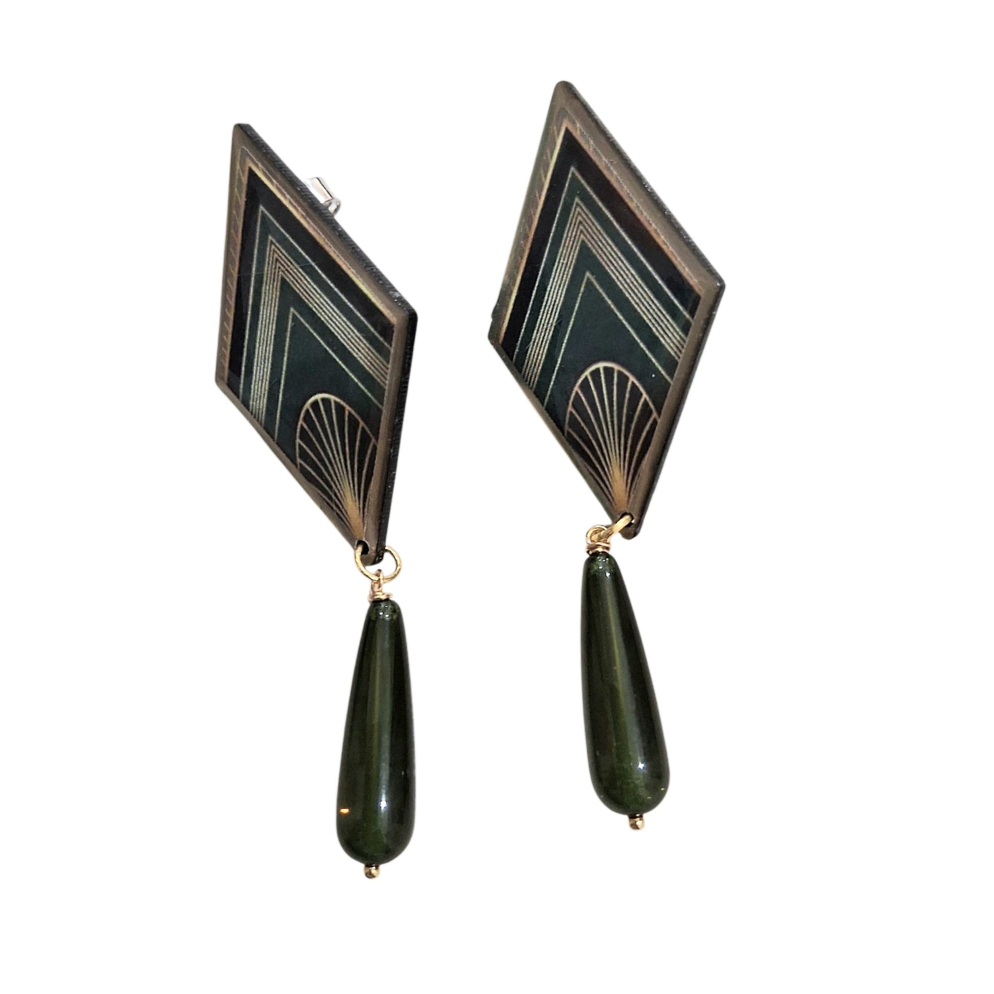Boucles d’oreilles pendantes au style Art Déco, ornées de motifs géométriques dorés sur fond vert. La dimension totale est de 7 cm x 2 cm. La goutte brillante apporte une touche élégante et sophistiquée, parfaite pour un style affirmé et raffiné.