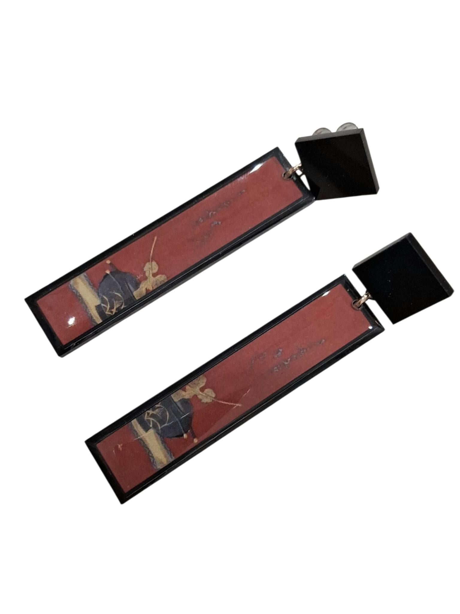 Boucles d’oreilles rectangulaires et pendantes, ornées d’un motif d’inspiration orientale sur fond rouge. La dimension totale est de 7 cm x 1 cm. Leur forme élancée et la finition brillante ajoutent une touche élégante et originale.