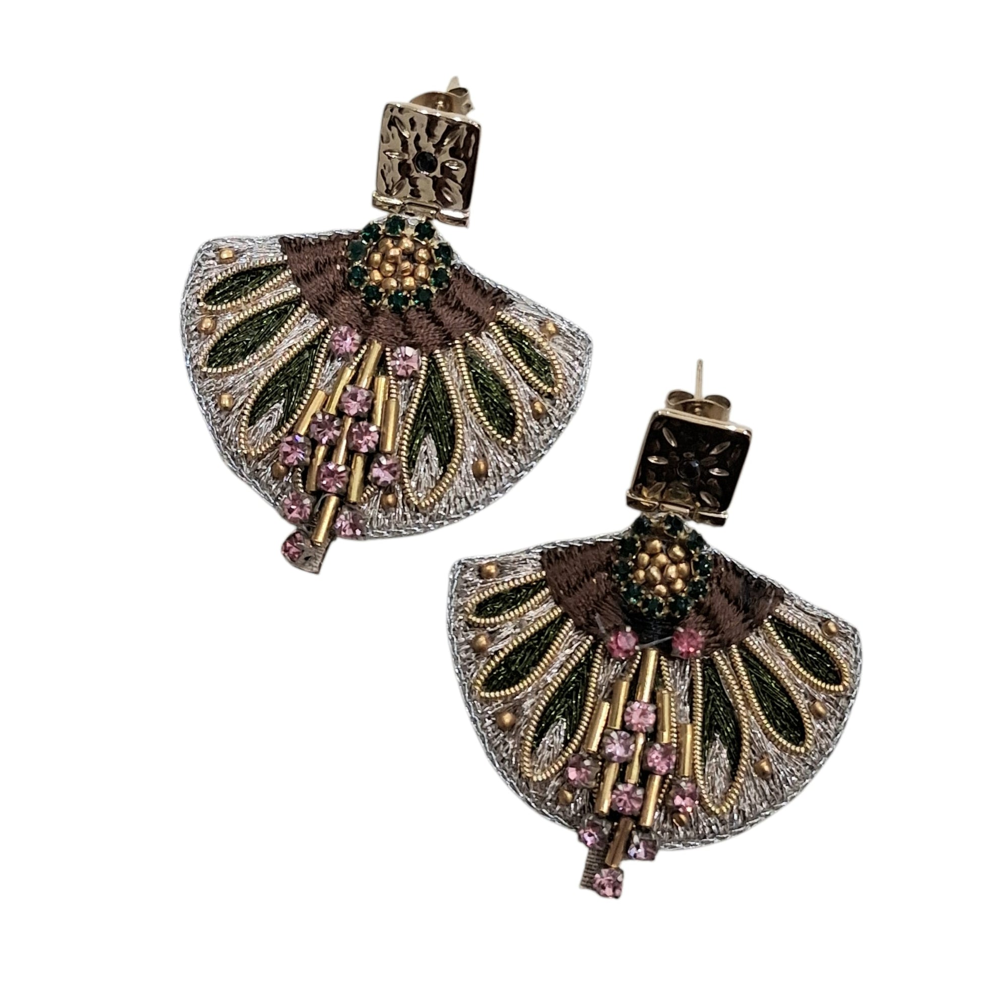Ces boucles d’oreilles en forme d’éventail sont une véritable œuvre d’art faite à la main. Elles allient acier doré, fils de soie raffinés, perles colorées et cuir, pour un rendu élégant et texturé.